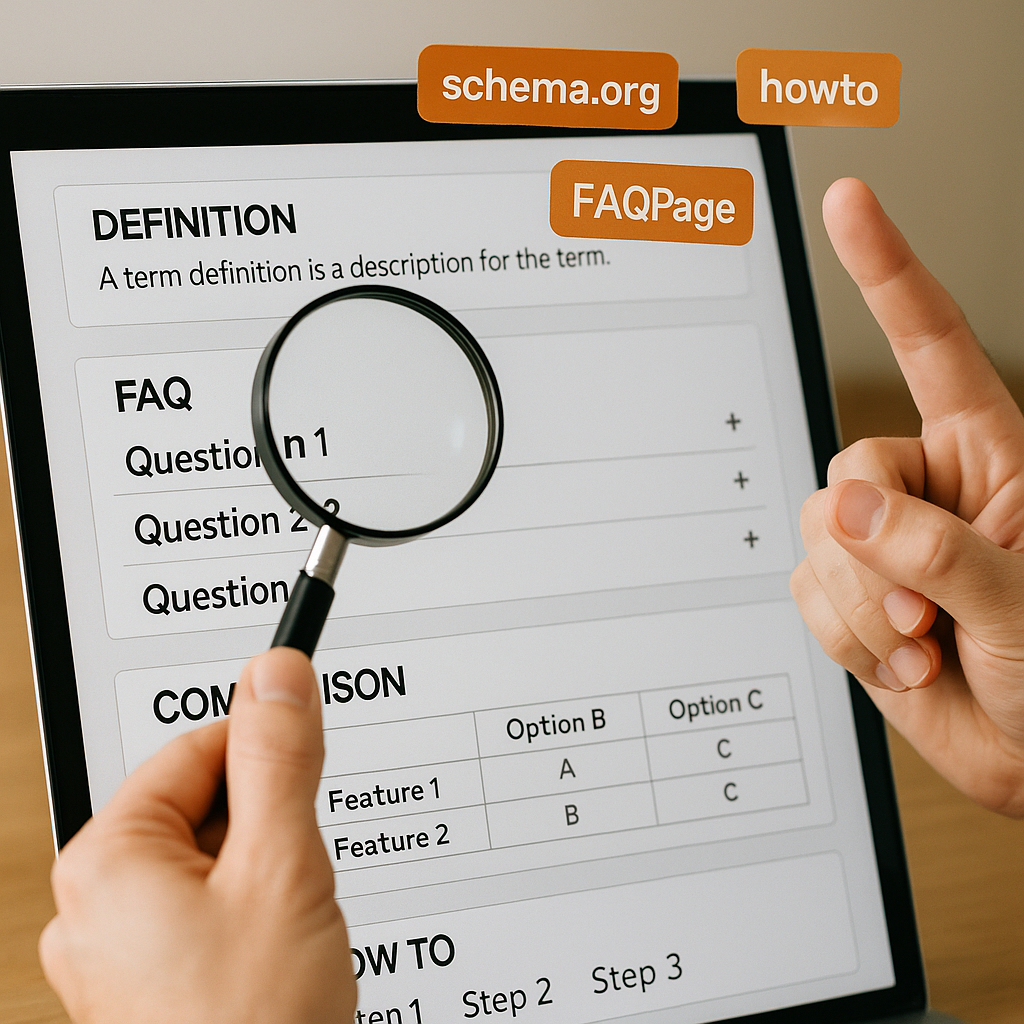 - Schema & structured data: products, articles, FAQs, events, local business — mark the important stuff so SERPs and knowledge graphs can use it.